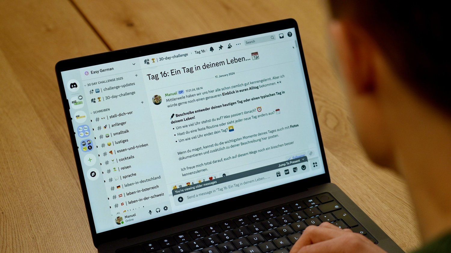 The discussions are conducted in a forum on Discord. After reading each day’s task, members can join the challenge of the day by posting in the thread. This could be a task such as sharing your favourite German recipe or book. Besides that you can ask questions, or respond to others' posts. The atmosphere is friendly and open, with everyone encouraged to participate as much or as little as they feel comfortable with.