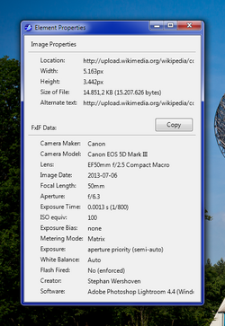[Bearbeiten | Quelltext bearbeiten]Nahezu alle modernen Digitalkameras beherrschen den Exif-Standard und speichern bei jeder Aufnahme zahlreiche Aufnahmeparameter, wie zum Beispiel: