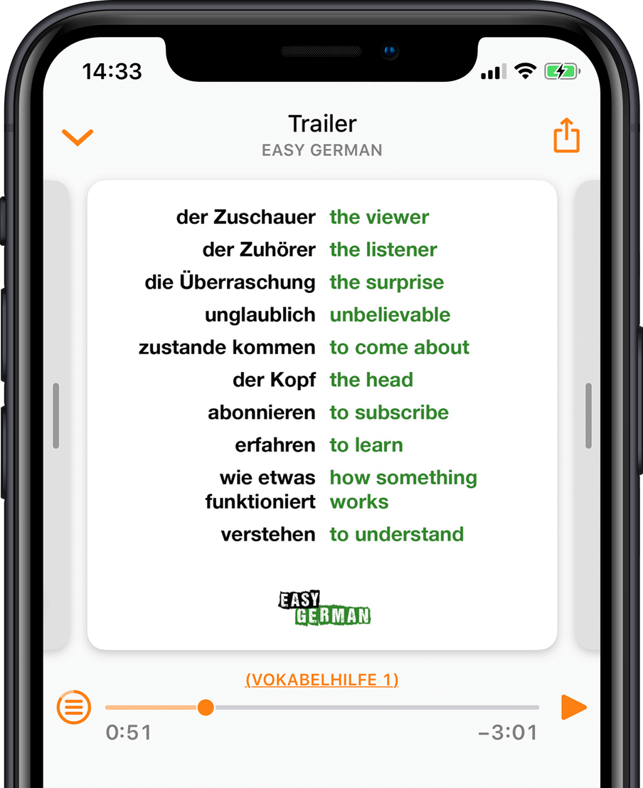 Twice per week, we discuss topics from Germany and around the world, explain words and expressions and answer your questions. Easy German members get access to interactive transcripts, our vocabulary helper and bonus content, so you can learn while you listen.